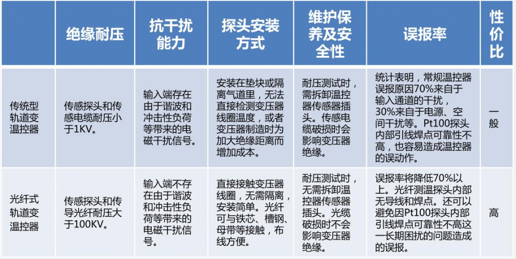 以傳統(tǒng)型軌道交通溫控器與光纖式軌道交通溫控 器的應用做對比,如下表: