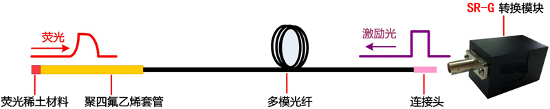 光纖探頭由ST接頭、光纖光纜、末端感溫端三部分組成。ST接頭是與光電模塊的連接部分;光纖光纜為傳光部分,內(nèi)部為石英光纖,石英光纖外部有涂覆層和包層,最外部為特氟龍保護(hù)套;末端感溫端含有感溫稀土材料,用于產(chǎn)生含有溫度信息的光信號(hào);光纖整體耐200℃高溫,外表直徑為3mm。長(zhǎng)期彎曲半徑13.2cm。短期彎曲半徑4.4cm。光纖引出線對(duì)地距離為0.4m的情況下,耐受工頻電壓100KV,持續(xù)時(shí)間5min。