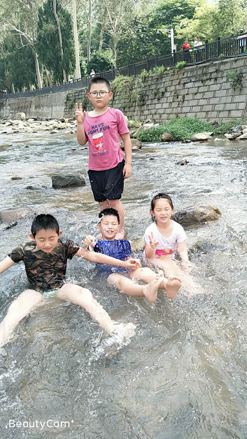 小孩們?cè)诖笕藗兊膸ьI(lǐng)下,在潺潺的溪水中歡樂(lè)的玩耍,夏季炎熱的天氣,唯有戶(hù)外的清涼能夠帶來(lái)一絲絲的暢快。